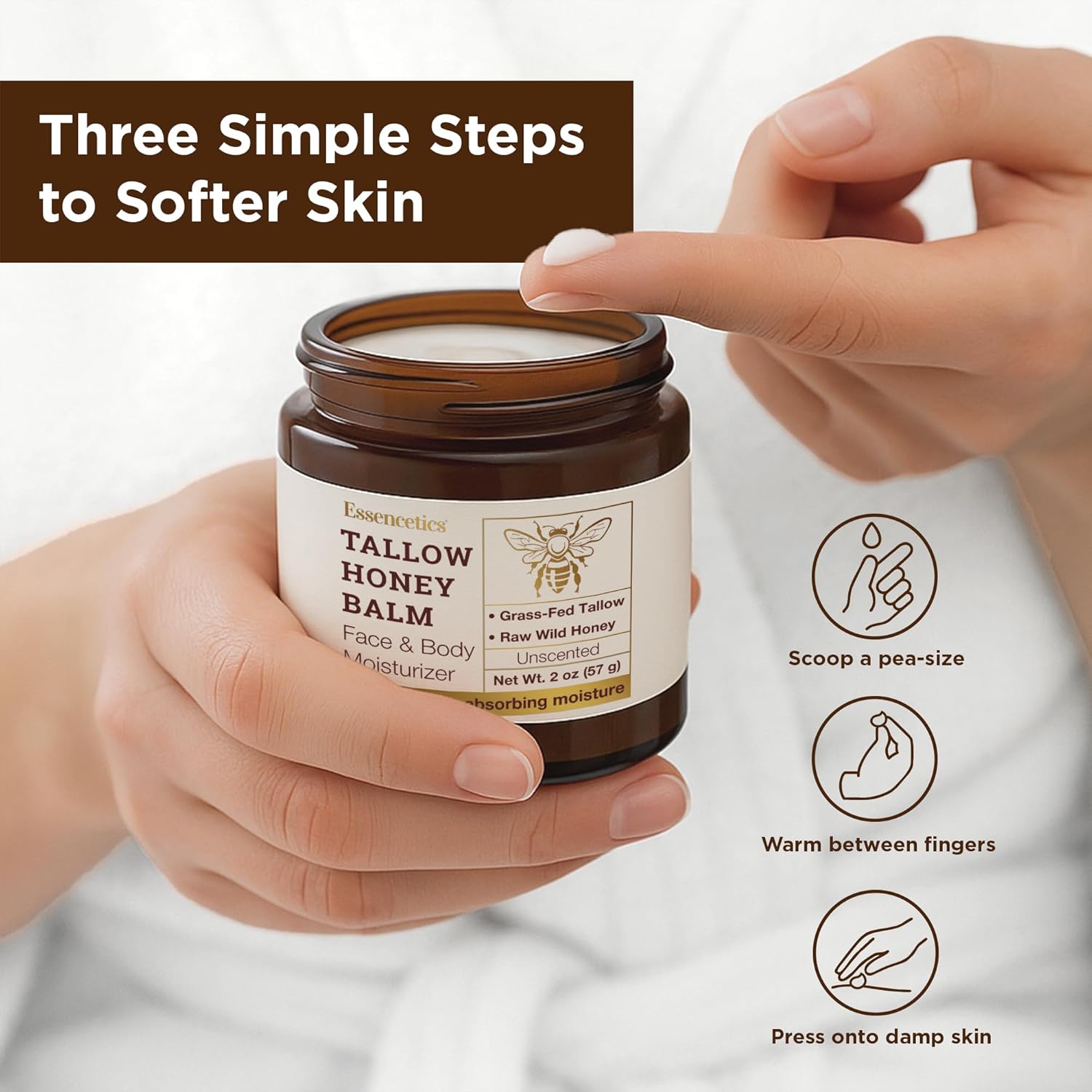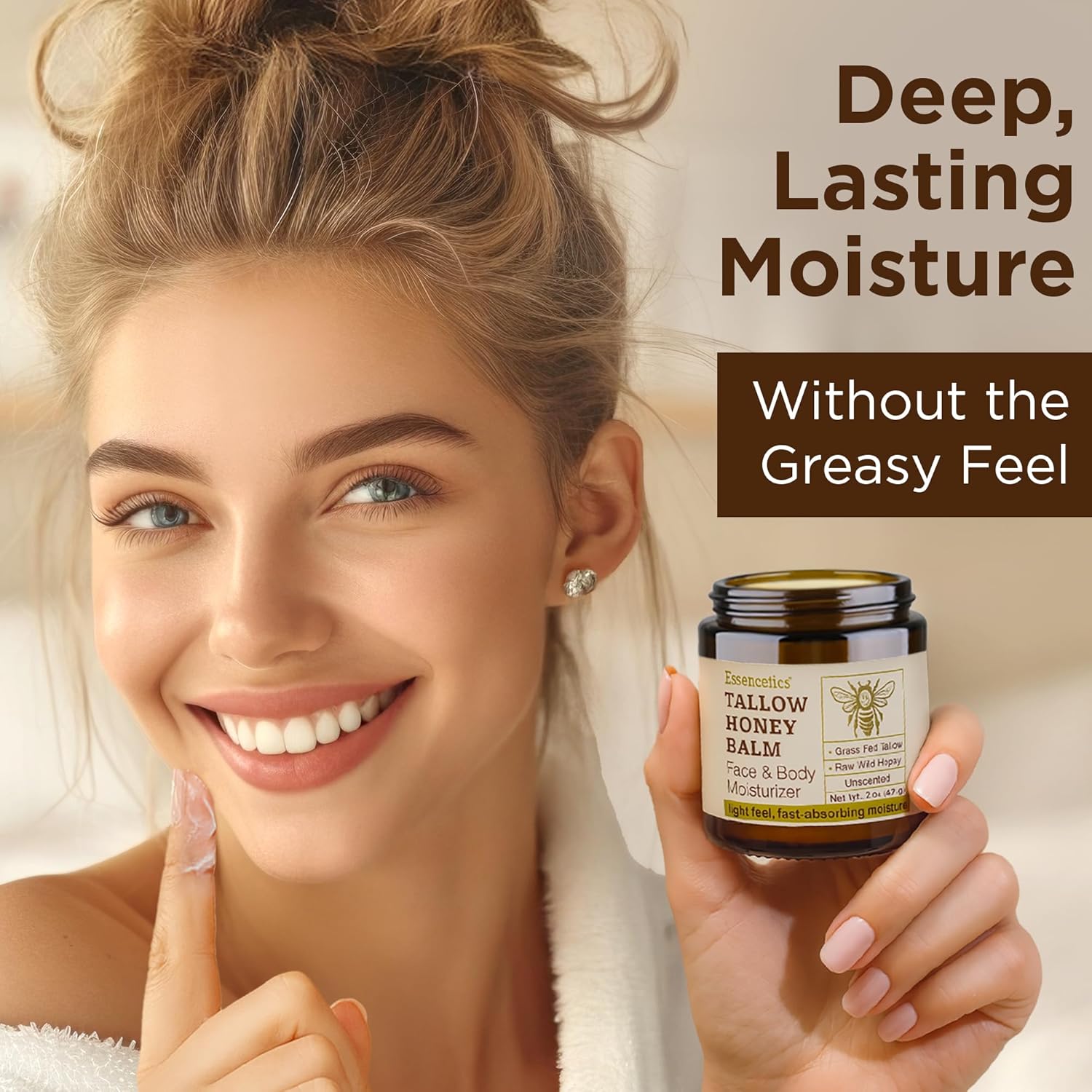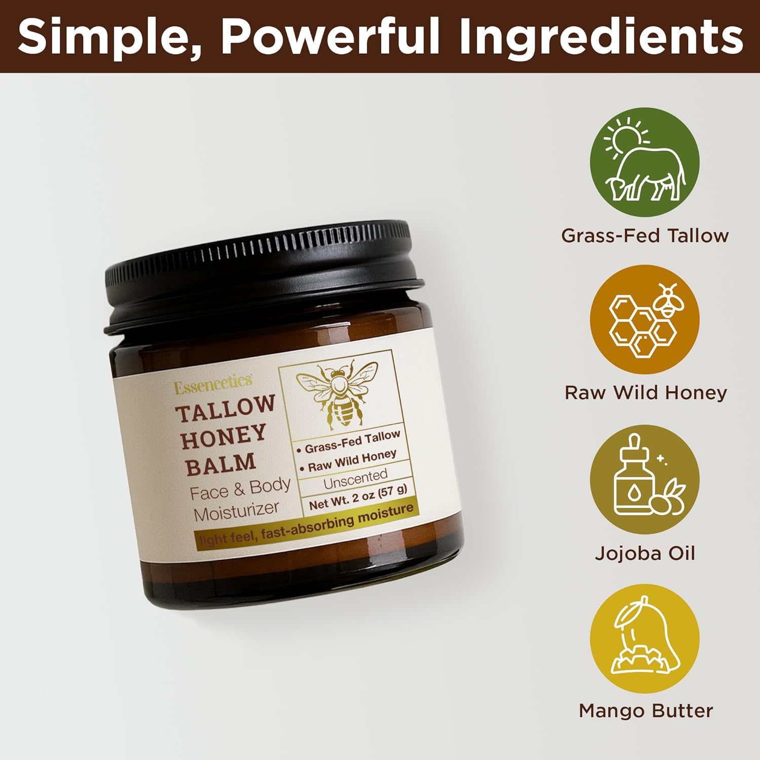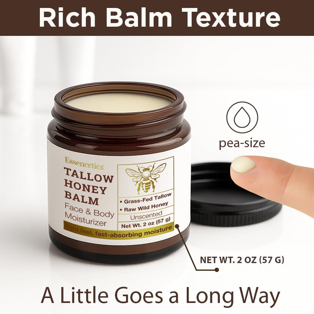 Essencetics Beef Tallow for Skin - Grass fed Beef Tallow Balm With Raw Honey - Tallow and Honey Balm for Face, Body Moisturizer for Dry Skin - (Unscented 2 oz)