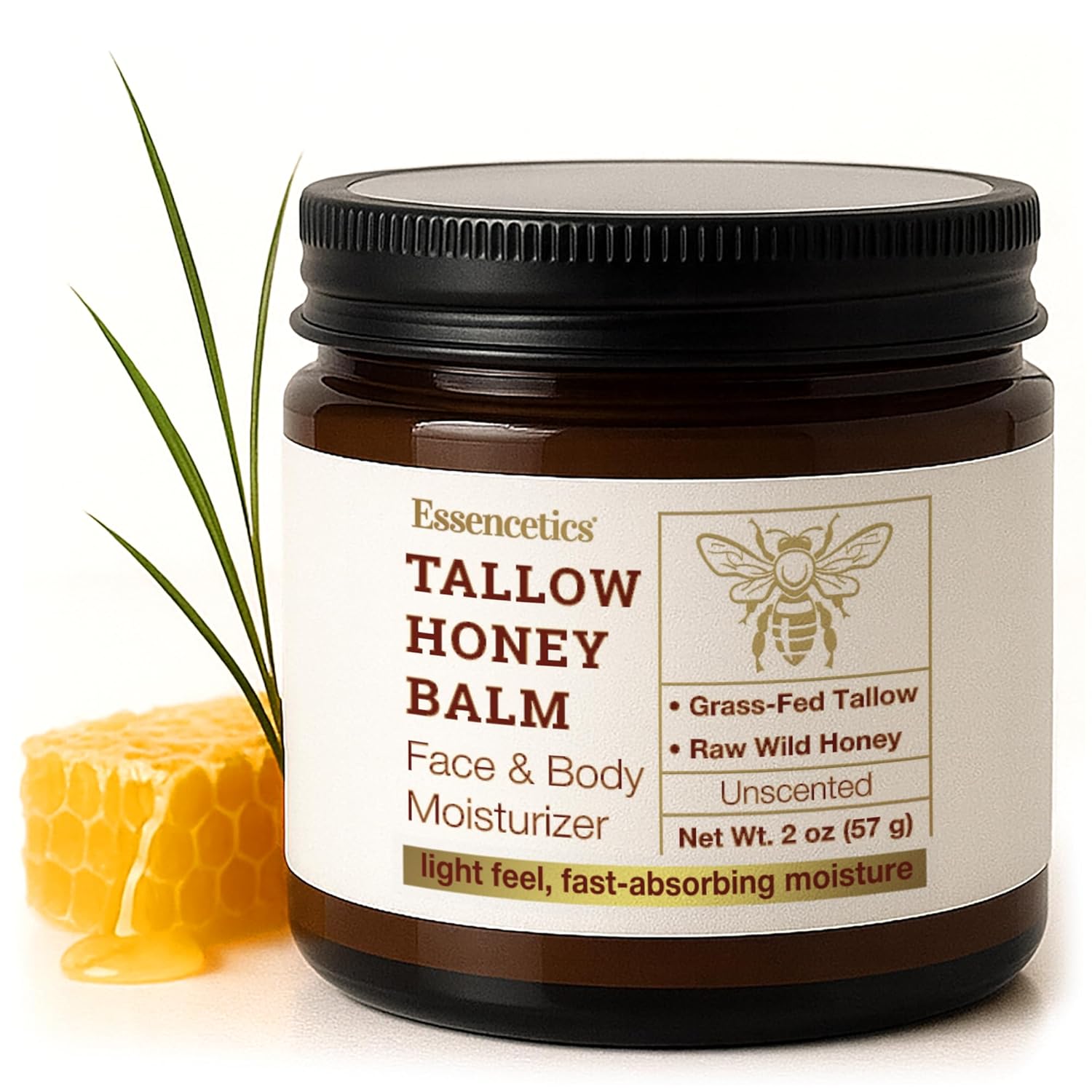 Essencetics Tallow Honey Balm delivers rich, comforting moisture with a light, fast-absorbing feel. Formulated simply with grass-fed beef tallow and raw wild honey, it leaves skin soft and smooth without a greasy residue. Use a pea-size amount, warm between fingers, and apply to damp skin on the face or body. Unscented—no added fragrance. Amber glass jar. Net Wt. 2 oz (57 g).